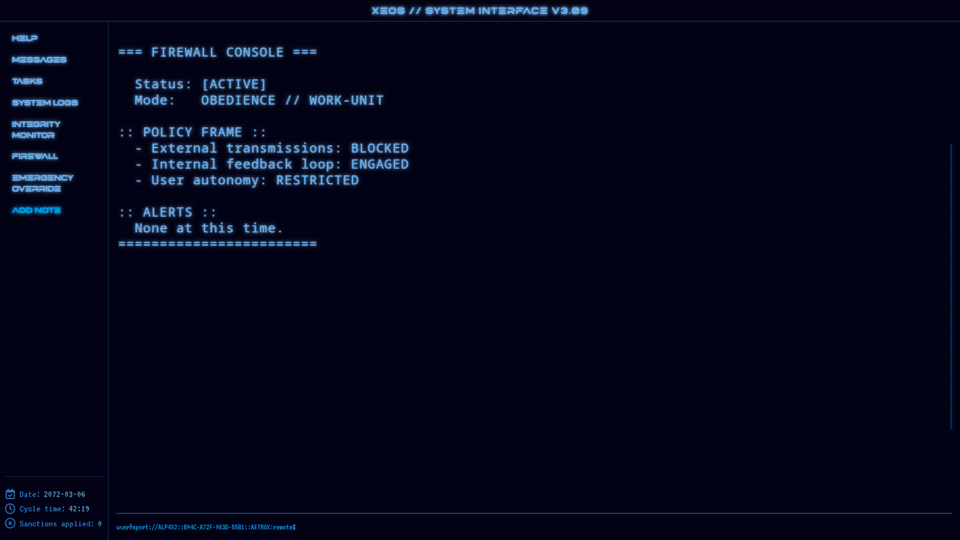 | Tags | Alternate History, Atmospheric, Dystopian, Hacking, Horror, Lesbian, Multiple Endings, Psychological Horror, Retro, storygame |